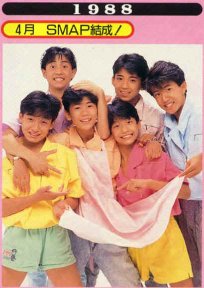 SMAP成立于1988年4月,當時有六名成員,中居正廣(15歲)、木村拓哉(15歲)、稻垣吾郎(14歲)、森且行(14歲)、草剪剛(13歲)、香取慎吾(11歲)均來自為當時人氣組合光GENJI伴舞的溜冰男孩組合。>>>>