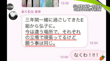 手術前夕,許多親友從大阪給弘子送來鼓勵她的信息。她的高中同學在信息中寫道:“我們是和你一起度過三年高中時光的E組同學。雖然我們現在身處不同地方,懷著不一樣的心境在拼搏,但是我們有著共同的愿望!