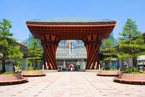 車站以人們耳熟能詳的能樂中常出現的金澤鼓為元素,“鼓門”造型的車站猶如一把迎接來客的張開了的雨傘。玻璃結構的“待客之道圓頂”構成車站整體。
