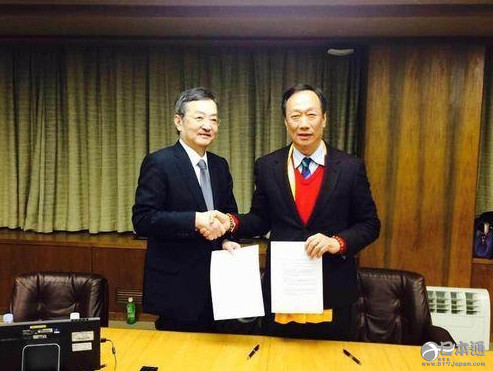 圖為夏普社長高橋興三與鴻海董事長郭臺銘(右)