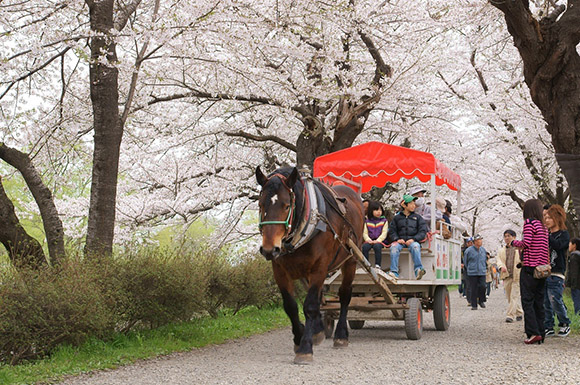櫻花節期間,色彩鮮艷的鯉魚旗漂浮在北上川的上空,河上穿行著游覽船,懷舊十足的觀光馬車穿梭在櫻木大道……