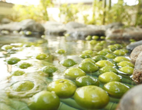 露天溫泉「花螢之湯」,投入了柑橘、廣柑等應季水果的果實溫泉,從早到晚都能盡情享受。