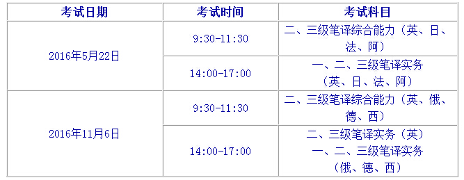 以北京地區為例,翻譯專業資格(水平)考試筆譯考試設有英、日、俄、德、法、西、阿共7個語種,每個語種均分為一、二、三級。其中,英語一級只在上半年舉行,英語二、三級上下半年各舉行一次;法、日、阿語一、二、三級均在上半年舉行;俄、德、西語一、二、三級均在下半年舉行。具體考試時間安排如下: