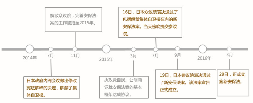 2014年7月,安倍晉三政府通過政府解釋,宣布可以行使集體自衛權。但是,在行使的過程中,涉及到諸多法律,安保法案應運而生。