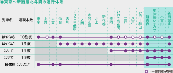 北海道新干線每天開行13對共計26輛列車,其中,東京—新函館北斗10對,仙臺、盛岡、新青森與新函館北斗之間各運行1對。