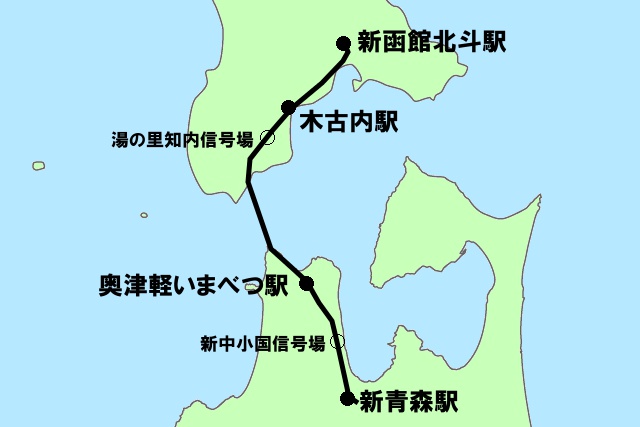 ②中途停車站2處,北海道一側的“木古內站”,青森縣一側的“奧津輕Imabetsu站”。