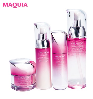 (從右到左) Luminizing Infuser(透白美肌臻白祛斑精華水) 150ml ¥5500日元; MicroTargeting Spot Corrector(微亮白淡斑校正液)30ml 11000日元;Luminizing Surge(乳液)75ml 6500日元;MultiBright Night Cream(晚霜)50g 11000日元