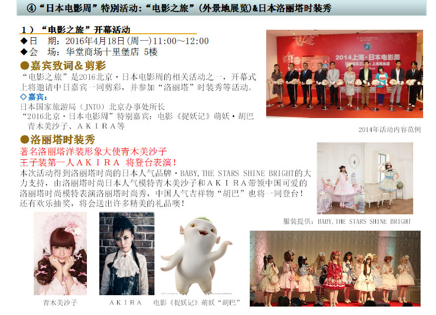此外,本次日本電影周還得到洛麗塔時尚的日本人氣品牌BABY,THE STARS SHINE BRIGHT的大力支持,由洛麗塔時尚日本人氣模特青木美沙子、AKIRA帶領中國可愛的洛麗塔模特進行洛麗塔時尚秀。
