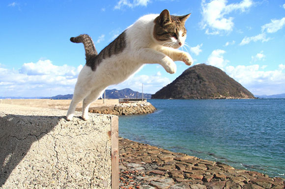 島上,貓星人飛躍防波堤的樣子,被戲稱為“飛貓”,讓人忍俊不禁。