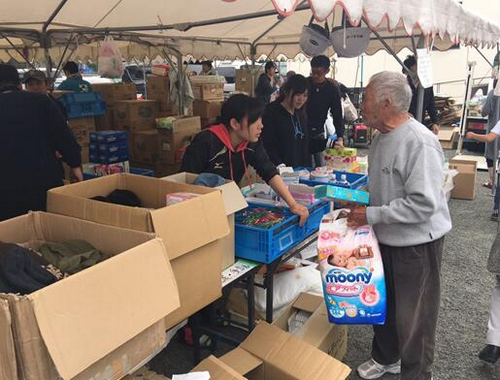 4月22日,益城町。一名志愿者正在為災民發放物資