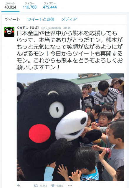 人民網東京6月2日電 據《朝日新聞》報道,日本熊本縣吉祥物“熊本熊”因地震推特賬號一度關閉,自6月1日起重新開通,并表示:“為了使熊本更加有精神,有更多微笑,我會加油的”。