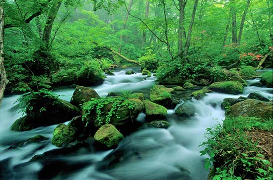從十和田湖的子之口到燒山為止長約14km的奧入瀨溪流,創造出了深邃的自然林、十多處瀑布和各式奇石怪巖的悠久自然景觀。到了5、6月份,新綠時節,樹木染上翠綠,其中奧入瀨溪流的代表當屬阿修羅溪流,它激流奔騰的景象,讓人們為之驚嘆。