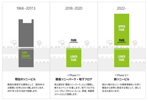 目前的索尼大樓于1966年開始營業,其中入駐了索尼公司的展示廳、商店等。據悉,該大樓將于2017年3月31日結束營業,之后拆除。在2018-2020年期間,其地上部分將作為活動場所“銀座索尼公園”開放,地下部分則將承擔索尼展示廳、飲食、商店等功能。2020年秋天起將開始建造新大樓,預計于2022年秋天恢復營業。該建筑占地面積為707.27平方米。(編譯:袁蒙 審稿:陳建軍)