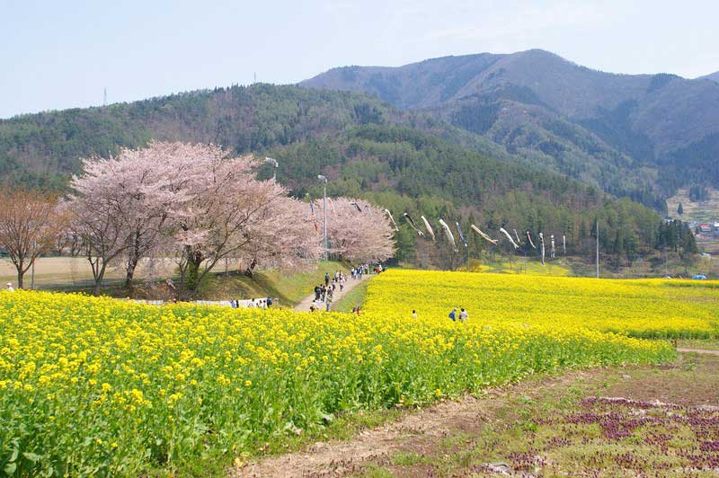 緊鄰千曲川的油菜花公園曾是童謠《朦朧月夜》的外景拍攝地,其黃昏的景色堪稱絕景,甚至被選為長野縣的日落觀賞地。