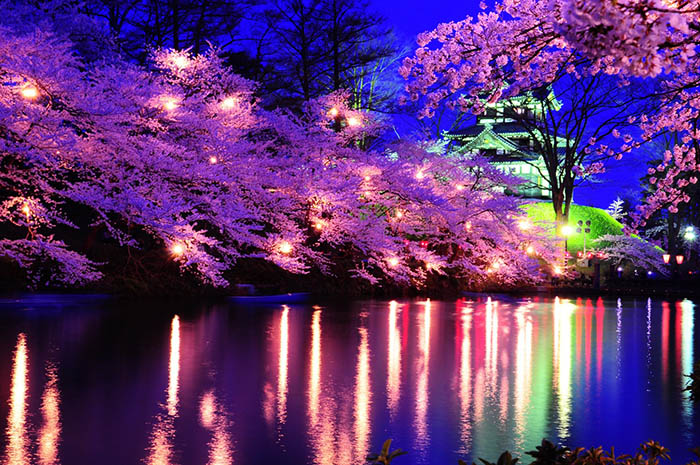 紙罩蠟燈下4000多株染井吉野與高田城三重櫓的燈光完美融合,極富夢幻美。