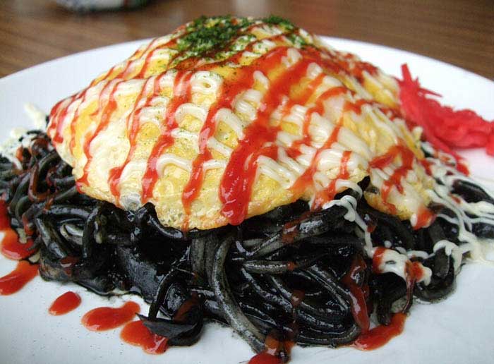 它使用當地金烏賊的烏賊墨,頂飾和造型因店而異,風格多樣,有的是擺有雞蛋的蕎麥面,有的是澆有豬骨湯的拉面。