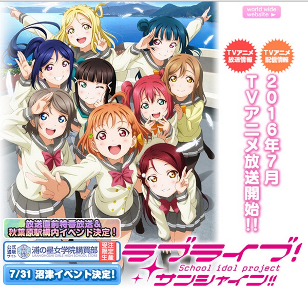 日升動畫、Lantis和《電擊G's magazine》共同打造的跨媒體偶像企劃“LoveLive!學園偶像計劃”于2015年公布的新企劃。作為企劃的一環,《Love Live!Sunshine!》于2016年7月動畫化。故事講述了私立浦之星女學院中9名少女為夢想成為“學園偶像”的故事。