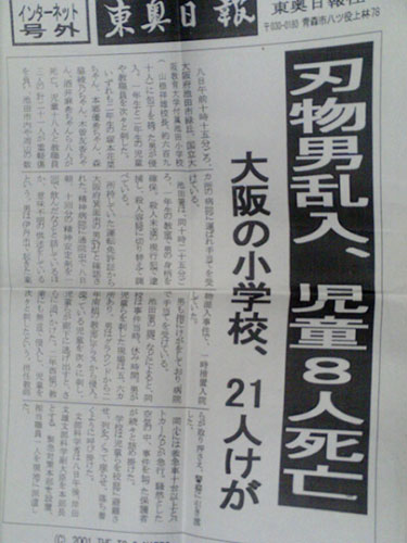 兇手宅間守持刀進入池田小學,共造成8人死亡、15人受傷,死者包括1名一年級學生和7名二年級學生。