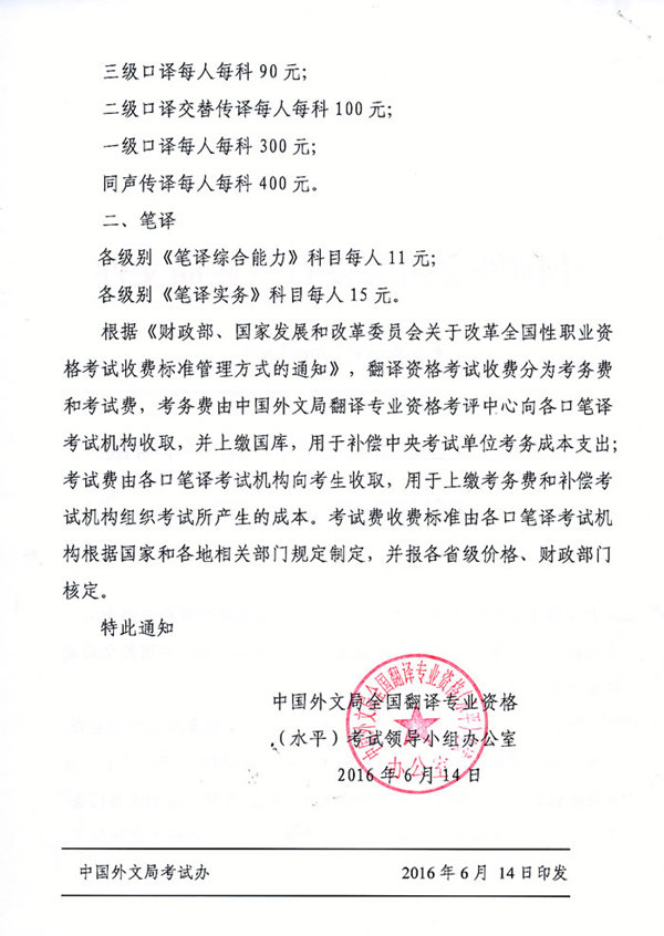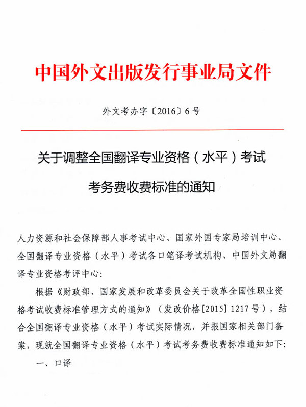 中國外文局翻譯專業資格考評中心發布了《關于調整全國翻譯專業資格(水平)考試考務費收費標準的通知》。