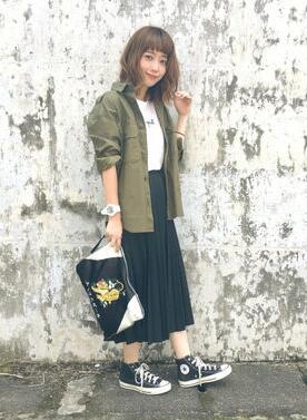 百褶裙搭配軍綠色襯衫