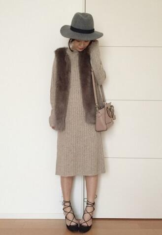 皮草搭配針織連衣裙