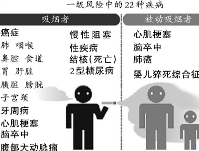 吸煙極有可能引發肺、咽喉、食道、胃、肝臟、胰臟、膀胱等臟器癌癥以及心肌梗塞、腦中風、腹部大動脈瘤等這類疾病,一般將因吸煙而患有這些疾病的情形,劃分為一級風險。被動吸煙可能引發肺癌、心肌梗塞、腦中風、兒童哮喘、嬰兒猝死綜合征等,這也被判定為一級風險;有吸煙史的人和被動吸煙人群患有諸如免疫力低下、糖尿病、結核、癡呆等認知障礙癥、關節炎等疾病,其風險被劃分為二級;煙民和被動吸煙人群出現咳嗽、發燒、頭暈、嘔吐、腹痛等癥狀被劃分為三級風險。四級風險則是確定與煙草無關的病癥。