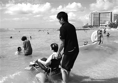 一名看護用特制輪椅推著老人在夏威夷海邊旅游。