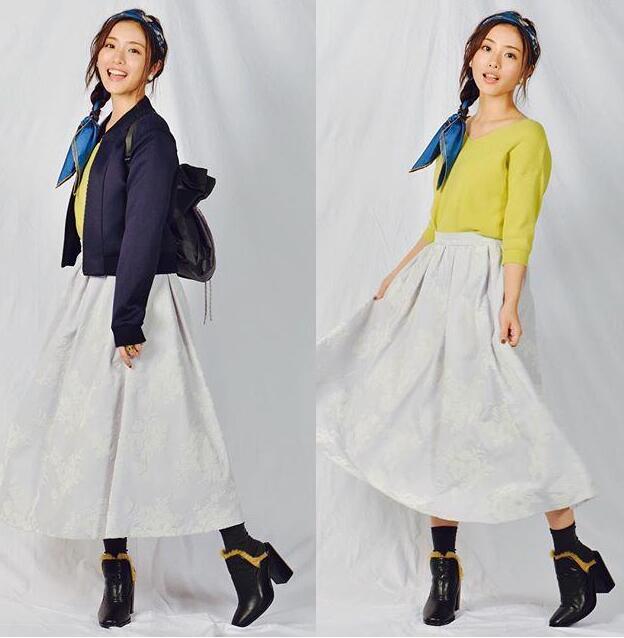 下半身選擇過膝裙或是長裙如果沒有掌握好整體平衡,就會顯得下半身有些拖拉,這時將上衣內搭或是選擇短款上衣就會提亮整體搭配