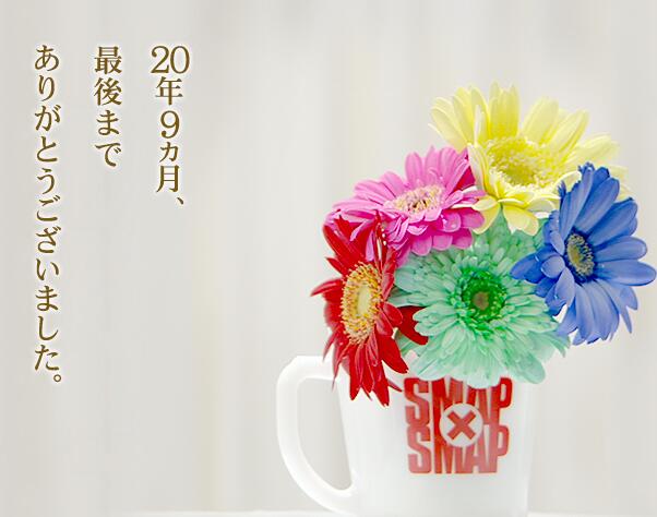 《SMAP×SMAP》的最后一期為5小時的特別節目,回顧了這個節目以及SMAP 20年來的經典場景,包括1996年播出的第1期《SMAP×SMAP》、原成員森且行退團、稻垣吾郎和草剪剛發生丑聞后的反省及復出、東日本大地震后SMAP訪問災區、五人一同旅行等場景。