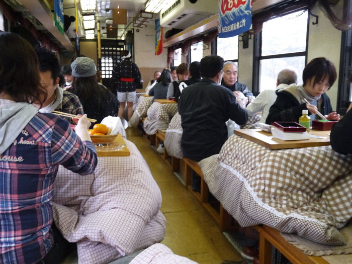 列車駛過冬季的青森平原,室外只有3度的低溫,但車廂里面卻是暖洋洋。香噴噴的烤魷魚,再配上青森地酒,加上窗外的美景,在寒冷的冬日,營造出溫氛圍,帶給你獨一無二的體驗。