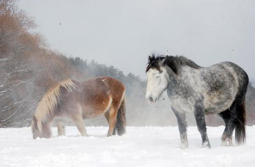 在日本最大級別的白色燈塔的襯托下,佇立于冬日嚴寒中的寒立馬,悠然吃草如田園詩一般的情景,陶醉著每一位來到這里的而游客。