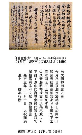 形成1萬多年前的諏訪湖自誕生以來,神秘的“御神渡”現象反復出現。在沒有文字的時代,人們無法考證是否出現過,但在日本平安時代的和歌里,人們就開始吟誦“御神渡”。御神渡最早的正式記錄是在約600年前的室町時代的應永4年(1397年),當時的諏訪神社的神官向幕府的報告文件的副本里有記錄。連續記錄是從嘉吉3年(1443年)到天和元年(1681年)間的《當社神幸記》,以及天和2年(1682年)到明治4年(1871年)的《御渡賬》。