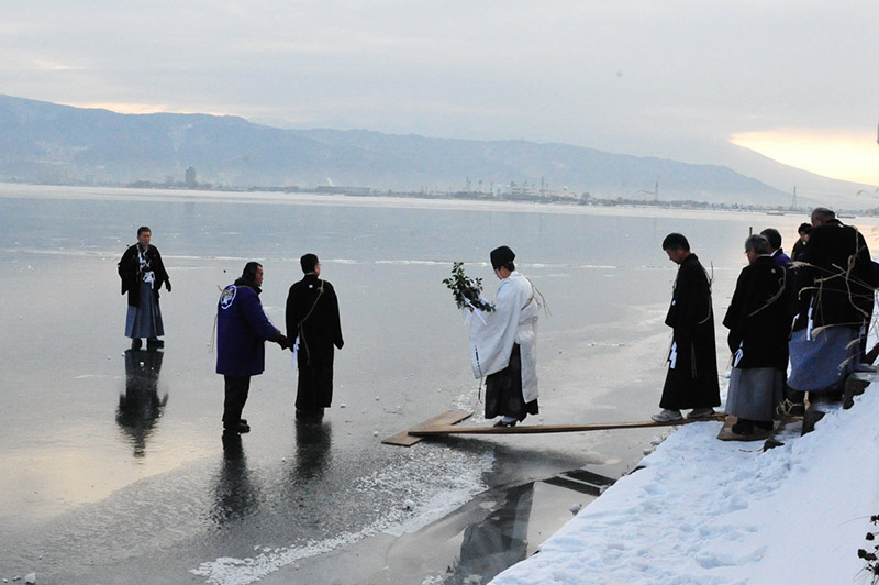 每年神社人員要去湖上觀察、確認、記錄是否出現了“御神渡”,這種做法叫做“拝觀式”。僅僅確認是否出現還不夠,還要確認冰碴隆起的裂口狀態,根據裂口狀態占卜預測今年是否回風調雨順、社會的兇吉等。