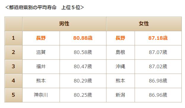 幾年前,日本公布了五年一次對都道府縣進行的平均壽命調查結果,長野縣男女的平均壽命成為了日本之最。男性的平均壽命為80.88歲,連續5年日本第一;女性為87.18歲,第一次超過了自1975年開始這項調查以來,一直名列第一的沖繩縣。