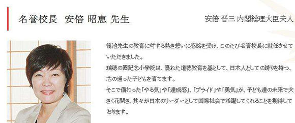 “瑞穗之國紀念小學院”名譽校長安倍昭惠(“瑞穗之國紀念小學院”網站截圖)