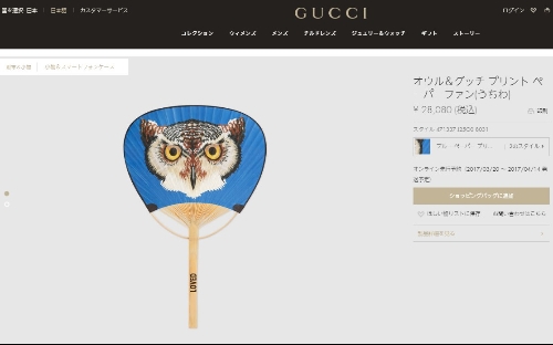 GUCCI推出的這款貓頭鷹造型團扇正面為藍色背景,印有一只貓頭鷹,并印有“LOVED”字樣。而背面則以白色巴紋雷鼓為背景,并用日語片假名寫著巨大的“GUCCI”,下面印有小字“日本產 MADE IN JAPAN”。