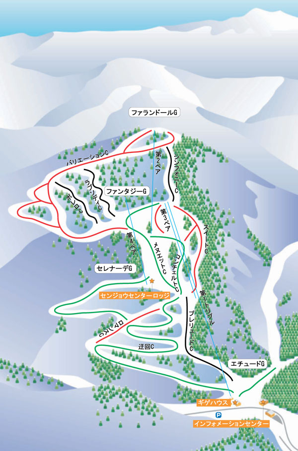 其中,法蘭多爾滑雪區里共有四條雪道,分別為變奏曲、交響曲、狂詩曲、波列羅舞曲;孟肭﹨^有兩條雪道,名為小步舞曲和組曲。小夜曲滑雪區場內雪道名為協奏曲、序曲、浪漫曲。練習曲滑雪區內僅一條雪道名為練習曲。整體看來,中級雪道偏多,適合各種水平的單板雙板雪友。