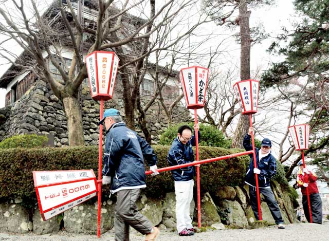人民網東京3月23日電 據日本《北陸·信越觀光導覽》報道,22日,日本福井縣坂井市丸岡觀光協會在丸岡城周邊設置了約300盞雪洞燈(一種紙糊的小行燈),以迎接即將開幕的丸岡城櫻花祭。雪洞燈高約2.5m,被設置在古城周邊的步行街等地。丸岡城櫻花祭將在4月1日至20日舉辦。