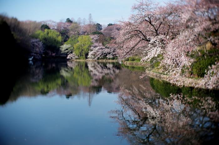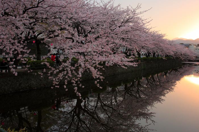 櫻花倒映在護城河水面上,是攝影愛好者爭相追逐的景點。