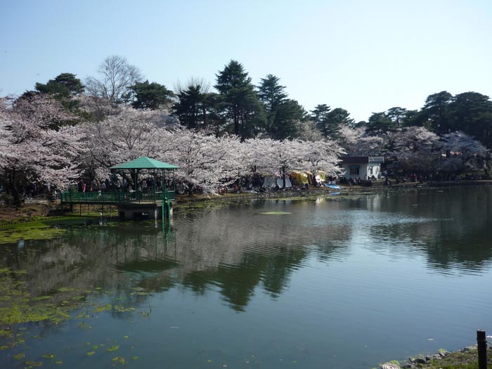 公園內的弁天湖、紅色的弁天堂,在粉紅的櫻花簇擁下,格外美麗。