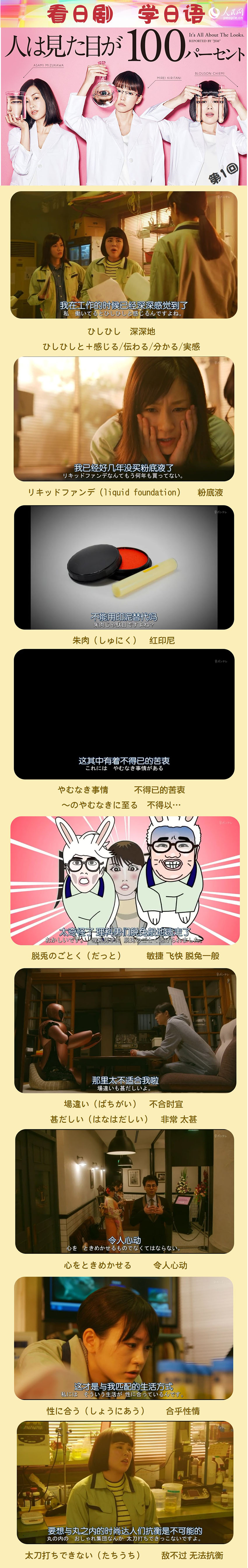 人民網東京4月18日電 2017春季日劇終于開播了!首先我們來圍觀一下桐谷美玲、水川麻美等主演的新劇《外貌協會100%》。引用豆瓣上一句扎心的短評:“真正的丑女都是在熒幕外看著你們這些扮著丑女的美女在演我們...”本期《看日劇·學日語》為你解析第一集中的一些日語詞匯與表達,單詞本準備好了嗎?