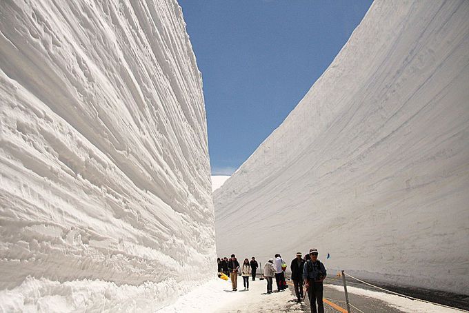 “立山黑部阿爾卑斯山脈路線”是穿越日本北阿爾卑斯山的一條全長90公里的旅游路線。即使過了5月,仍有很大的積雪量。