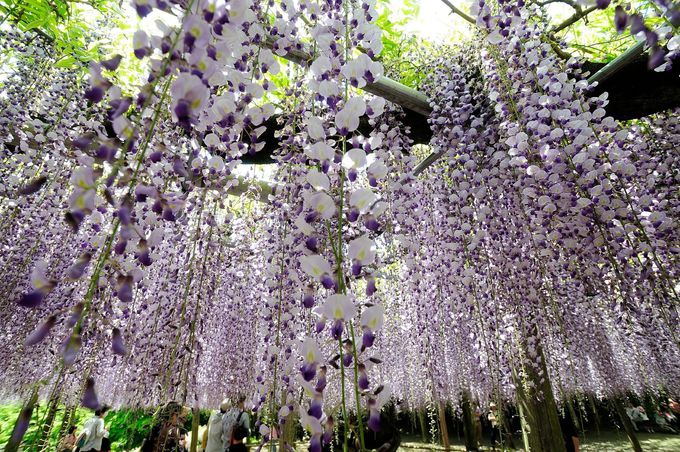 最值得一看的便是花下面積達1850坪的紫藤花架和紫藤隧道。隧道有80m和220m兩種,一旦到了花期,22種紫藤花便競相盛開。在進入園內之初,就會為那夢幻的美所迷醉。