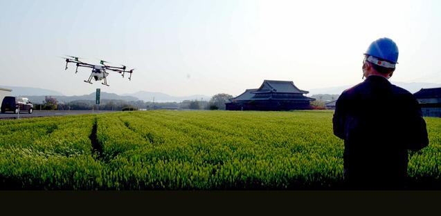 本月,在觀音寺市稻米生產組合代表高橋直樹(38歲)管理的麥田,直徑1.8米的無人機帶著預防紅霉菌病的農藥,從田埂升上了天空進行噴灑。