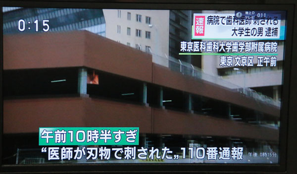 據介紹,9日上午10點半過后,警方接到東京醫科齒科大學齒學部附屬醫院的報警電話稱“醫生被刀刺傷”。警方經調查了解到,一位41歲的男性牙科醫生被像刀一樣的東西刺傷。該醫生神志清楚,正在該大學的醫院接受治療。