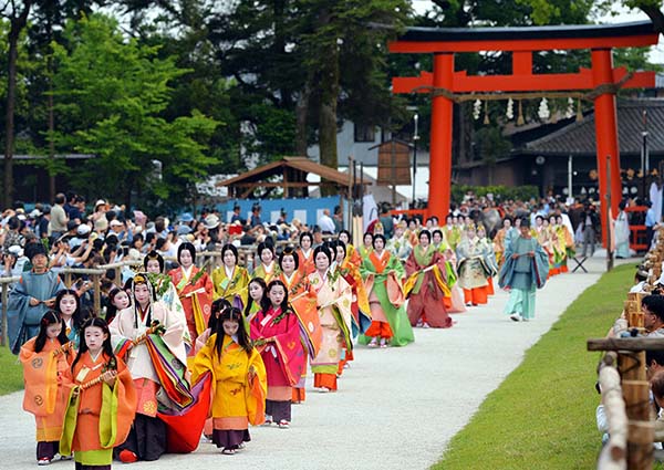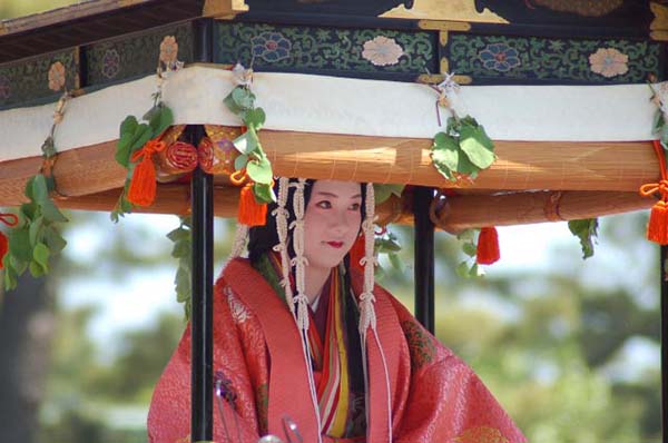 在這一天,京都街頭會出現身著絢麗奪目平安貴族服飾、畫著古代妝容的游行隊伍,再現的是當年向下鴨、上賀茂兩神社傳送天皇諭旨和供品的官員隊伍場面。