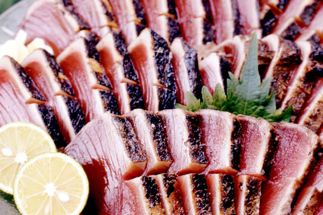 高知縣的鰹魚生魚片味道特別鮮美,還有一種有名的料理叫做“半生鰹魚”。具體做法是把鰹魚的皮用小火烤至金黃色,但并不烤透?具^之后立即浸入冷水并迅速瀝干水分,接著,佐以蔥、姜、大醬、蒜等,蘸上“ponzu(一種合成醋,是在酸橙、酸橘等柑桔類的榨汁上加入醬油、甜料酒、海帶等調出鮮味的調味料)”,想想就覺得美味。