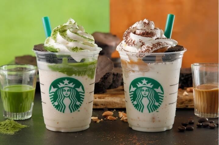 “巧克力蛋糕星冰樂”以杏仁為底料,杯中放入了一整個巧克力蛋糕,然后鋪一層濃濃的抹茶醬,并加以手打奶油、抹茶粉作為裝飾?蓪⑶煽肆Φ案鈹囁,使之與星冰樂混合之后再食用。(編譯:周帥 審稿:袁蒙)(來源:Modelpress)