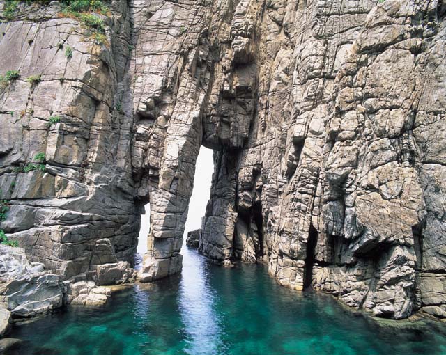 受浪蝕作用形成的奇巖、洞窟、斷崖綿延6公里,包括蝙蝠孔,隱水,地獄門,網掛巖,獅子巖,夫婦龜巖等等。還可以乘坐從小浜港出發的游覽船,進行近距離觀賞。