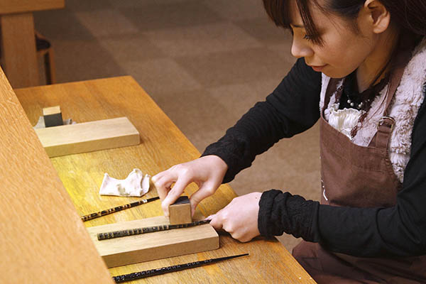 在貝殼、金箔、銀箔上多次涂漆后,再經過反復打磨,形成美麗花紋。這種“若狹涂”工藝過去還被稱為“寶石涂”。